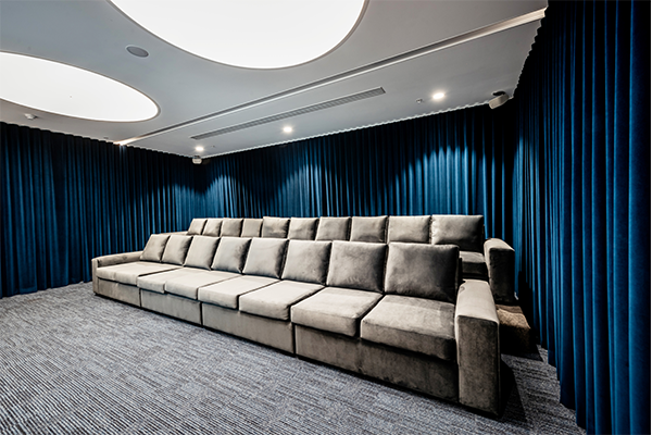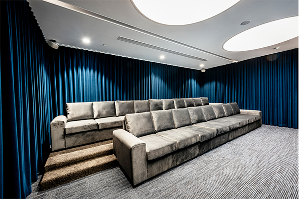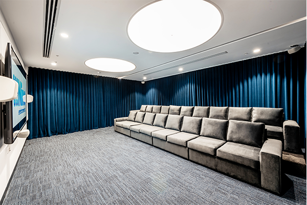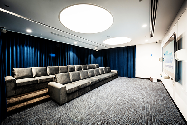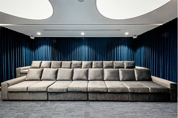 Channel Nine contracted us to custom build their new screening room in their Sydney head office. The job consisted of two critical and custom made elements. The first element was a carpeted platform, this not only provided a cinema type experience to the room, it also allowed for two rows of lounges, and people to be sitting down on said lounges without blocking any views of the big screen. The second element was two extra large lounges, each of which were not only long enough to comfortably seat ten adults in the top row and eight adults in the front row, but also deep enough for everyone to truly lounge and relax. We went for a darker colour palette in each element as it was vital that everyone using the room did get that authentic cinema feel and were able to unwind. Each of the elements were a compliment to each other, and the materials and colours used. They were also specifically designed for the room so they fit perfectly and so the overall space in the room was used to advantage.